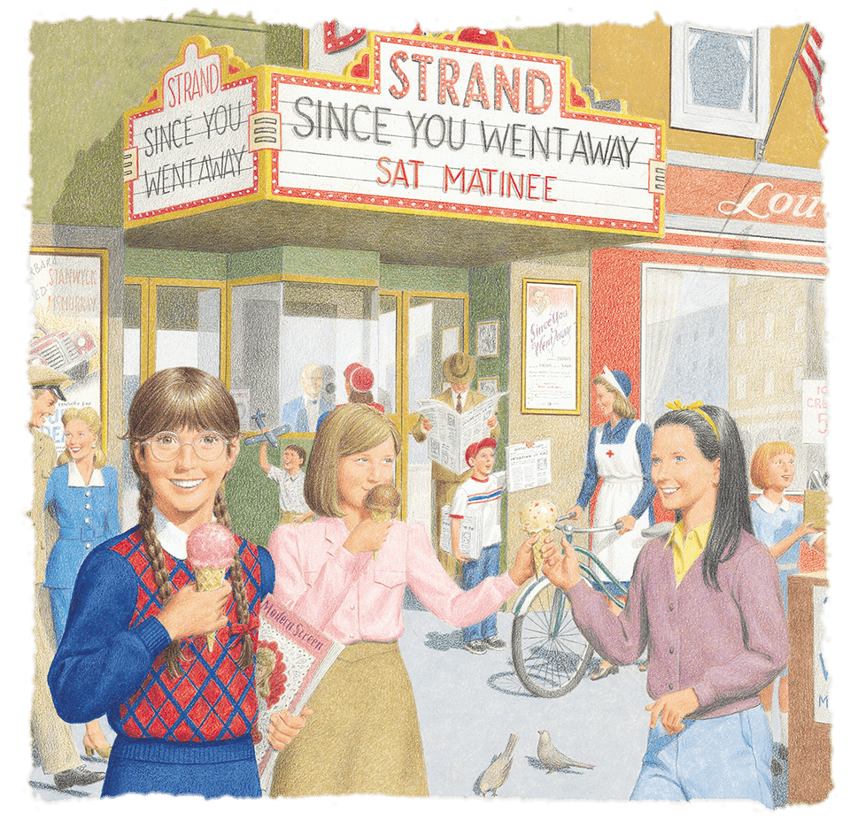 Molly goes to the movies every Saturday afternoon. In 1944, movies cost ten cents, and Molly could stay all day to watch newsreels and feature films.