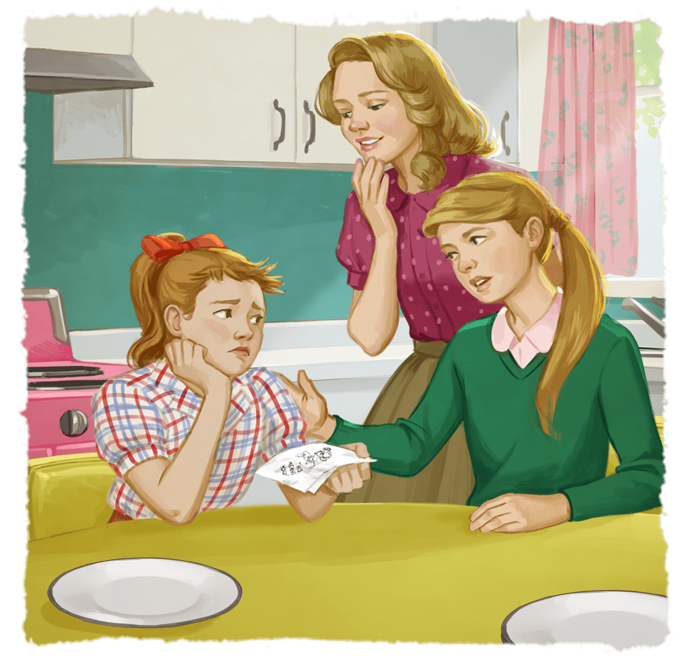 Maryellen’s two sisters. Carolyn, fourteen, loves music, and her social life gives Maryellen a peek into her own teenage years. Six-year-old Beverly pretends to be a queen.